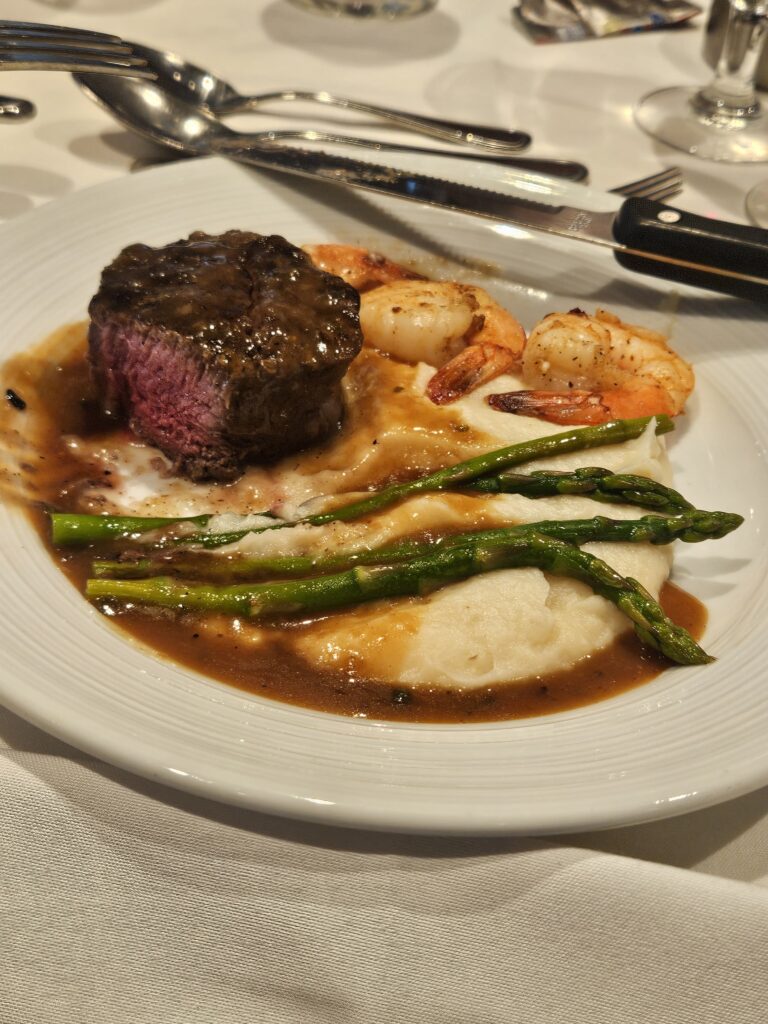 The meals were great. I ate things like duck confit, filet mignon, veal pasta, sea bass, onion soup (my favorite soup), and other gourmet dishes for dinner. The best soup of the cruise was seafood volute, and it was a very silky soup with a distinct lobster flavor, almost like lobster bisque. We rarely had lunch, but on those days we did, we had sushi, a nice surf and turf, and hibachi. Breakfast was usually just something small like a donut or something. Here is a picture of the second course of day three’s lunch.