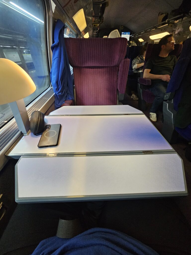 We soon boarded the train and it headed off to France. The train was nice, and since we paid for first class tickets, we got comfortable seats and were seated on the upper deck, surrounded by large windows.