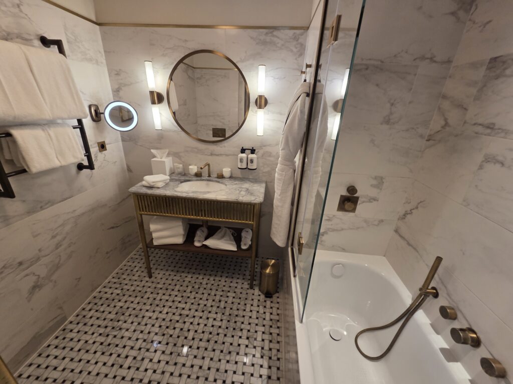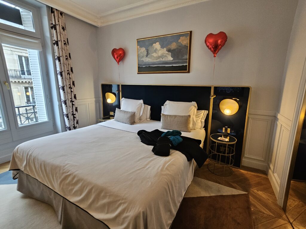 We walked a block back to the hotel and arrived to find the bed had been turned down, and cans of spring water were left on each bedside table and some jazz was playing in the room. Oddly enough, the song was c’est si bon. Nice touch.