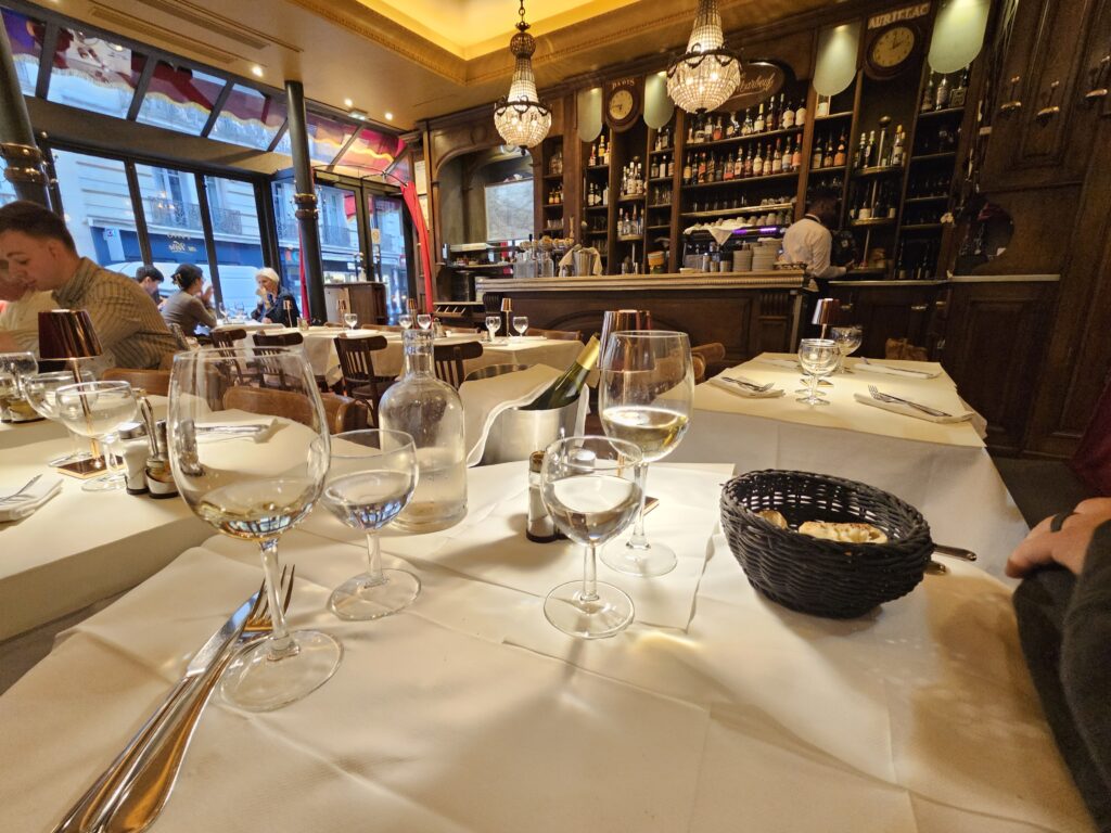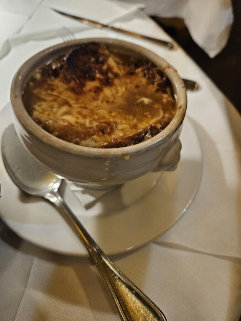 Looking at the wine list, I wanted a Riesling, and they wouldn’t only sell non-French wines by the bottle. The wine was 54 Euros for the bottle, and (French) Onion Soup was 15 Euros.