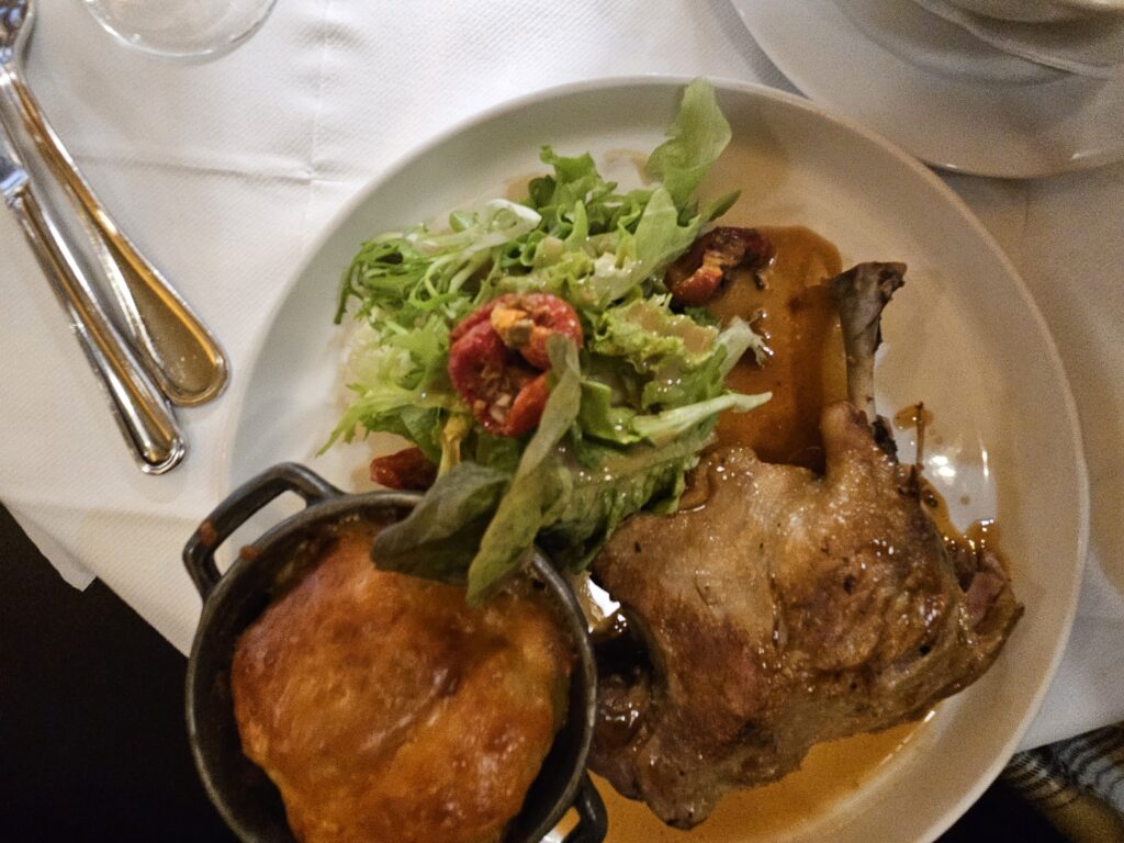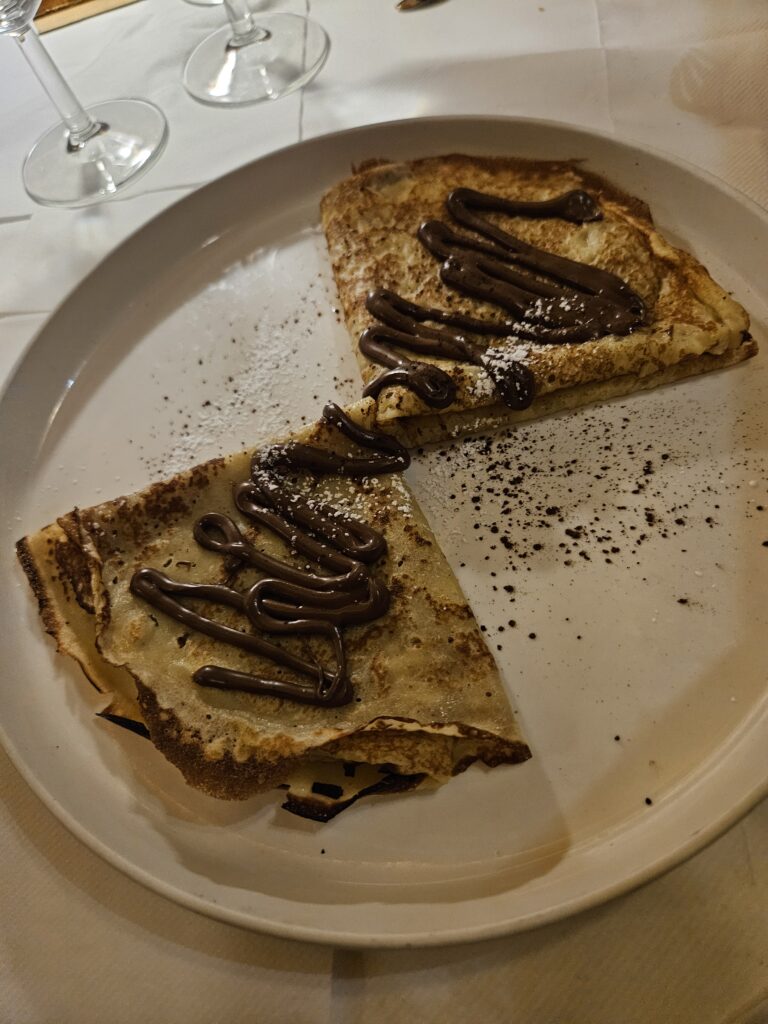 Dinner was duck confit, followed by a shared crepe for dessert.